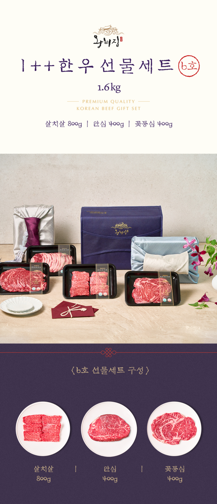 | 상품구성 | 1++ 한우 선물세트 6호 / 1.6kg [살치살 800g, 안심 400g, 꽃등심 400g] |
