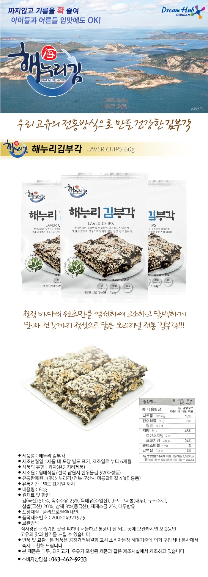 원재료(원산지) 및 함량김(국산)50%, 옥수수유25%[옥배유(수입산),d-토코페롤(대두),규소수지], 찹쌀(국산)20%, 참깨 3%, 제재소금 2%, 대두함유생산자 및 소재지제조원 : 월매식품/전북 남원시 한우물길52, 유통전문판매원: (주)해누리김, 전북 군산시 미룡갈마길 43용량(중량),수량전통맛 김부각 60g * 8봉보관방법/유통기한직사광선이나 습기찬곳을 피하고 통풍이 잘되는곳에 보관/ 제조일로부터 6개월제조연월일제조일로부터 120일이내 상품식품의 유형과자(유탕처리제품)소비자상담 관련 전화번호080-777-9233