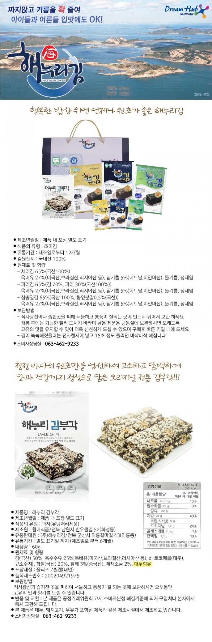 원재료(원산지) 및 함량재래김 65%(국내산100%), 파래김 65%[(김70%,파래30%) 국산100%],옥배유27%(미국산,브라질산,러시아산등), 참기름5%(베트남산,미얀마산), 들기름, 뽕잎분말, 맛소금생산자 및 소재지제조원 : 월매식품/전북 남원시 한우물길52, 유통전문판매원: (주)해누리김, 전북 군산시 미룡갈마길 43용량(중량),수량전장김6봉+도시락김20봉+김부각 60gx4봉보관방법/유통기한직사광선이나 습기찬곳을 피하고 통풍이 잘되는곳에 보관제조연월일주문일로부터 90일이내상품으로 출고/제조일로부터 12개월/제조일로부터6개월(김부각)식품의 유형조미김/과자(유탕처리제품)소비자상담 관련 전화번호063-462-9233